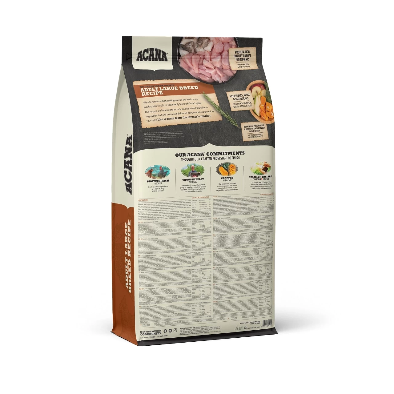Lorsqu’il s’agit de nourriture pour chiens ACANAMD, chaque ingrédient compte, c’est pourquoi notre recette pour chiens adultes a été soigneusement formulée pour répondre aux besoins des chiens adultes de grandes races. Riche de 60 % d’ingrédients d’origine animale de haute qualité, comme du poulet frais, équilibrée avec 40 % de fruits, de légumes et d’ingrédients végétaux, cette recette fournit à votre chien adulte de grande race les protéines et les éléments nutritifs dont il a besoin. Avec ces ingrédients équilibrés et de haute qualité, chaque repas de la recette pour chiens adultes de grandes races d’ACANA ressemble à un repas directement acheté sur le marché.
