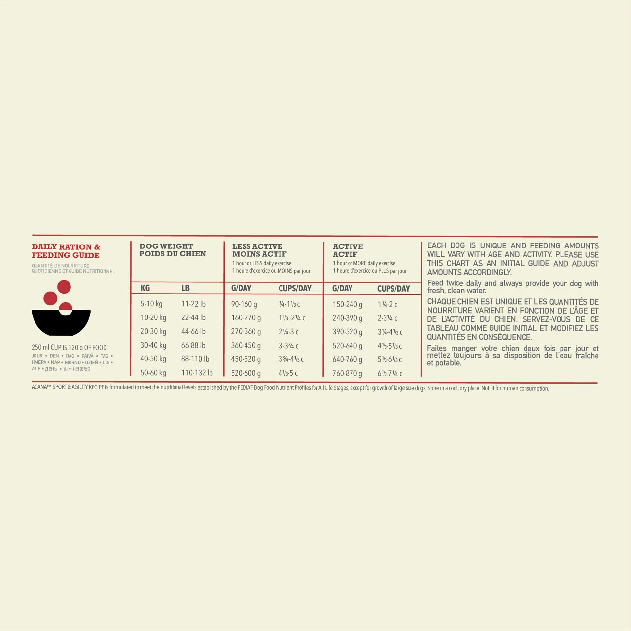 Lorsqu’il s’agit de nourriture pour chiens ACANAMD, chaque ingrédient compte, c’est pourquoi notre recette Sport et Agilité a été soigneusement formulée pour répondre aux besoins uniques des chiens de toutes races actifs et énergiques. Riche de 75 % d’ingrédients d’origine animale de haute qualité, comme du poulet frais, équilibrée avec 25 % de fruits, de légumes et d’ingrédients végétaux, cette recette fournit à votre chien actif les protéines et les éléments nutritifs dont il a besoin. Avec ces ingrédients équilibrés et de haute qualité, chaque repas de la recette pour chiens Sport et Agilité d’ACANA ressemble à un repas directement acheté sur le marché.