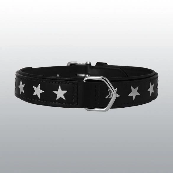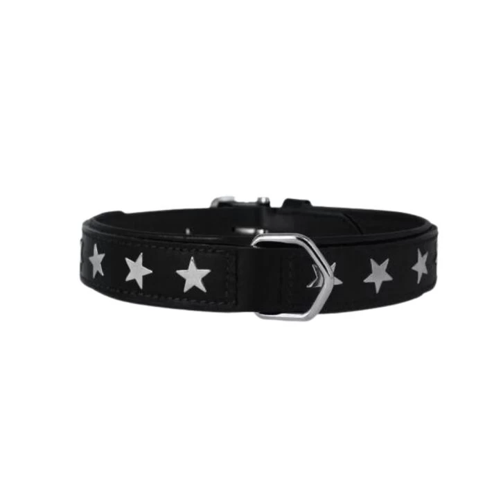 Collier cuir véritable embordé de couleur noir avec des étoiles métal rivetées.