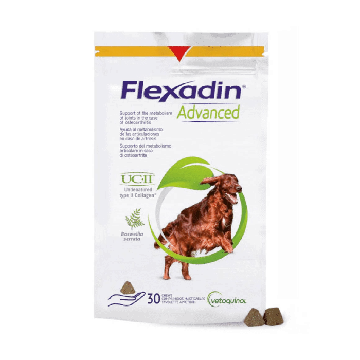 Flexadin Advanced contient de l’UC-II (40mg/ bouchée) qui est une forme de collagène de type II natif non dénaturé. Il s’agit d’une approche novatrice dans la gestion de l’arthrose chez le chien avec des effets prouvés.