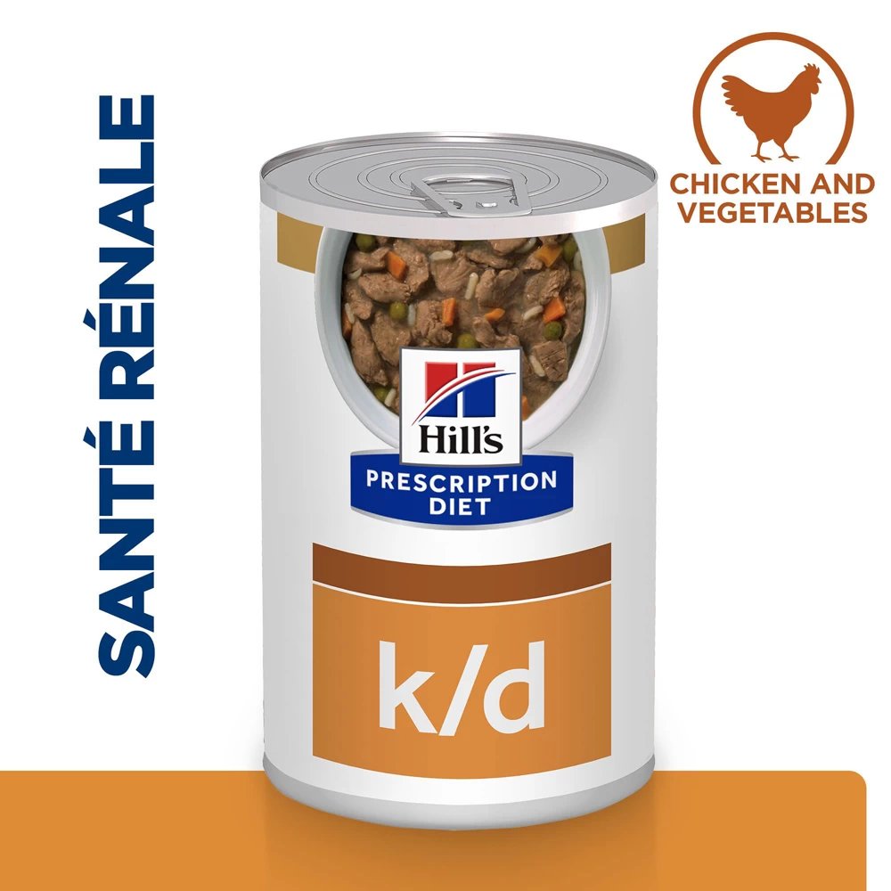 Hill’s PRESCRIPTION DIET k/d Mijoté pour Chien au Poulet & Légumes ajoutés est un aliment diététique complet en vue du soutien de la fonction rénale en cas d’insuffisance rénale chronique ou temporaire chez le chien adulte. Cet aliment contient une faible teneur en phosphore et une teneur réduite en protéines de qualité élevée.