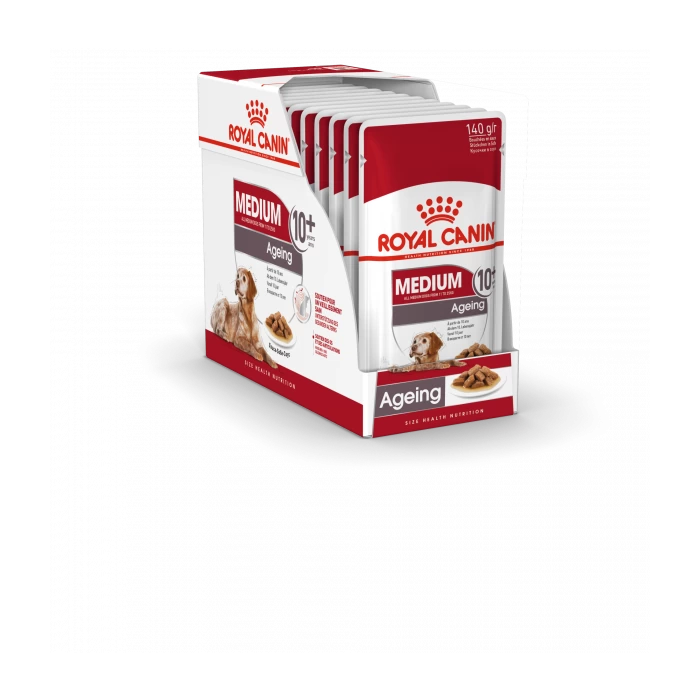 ROYAL CANIN® Medium Ageing 10+ in Gravy (en sauce) est spécialement formulé pour répondre à tous les besoins nutritionnels des chiens comme le vôtre et convient aux chiens de taille moyenne de plus de 10 ans. pesant entre 11 et 25 kg.