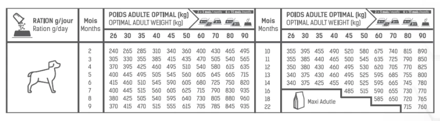 Une énergie métabolisable raisonnée, un apport en calcium et phosphore modéré en font l’aliment de choix pour les chiots de grande taille qui nécessitent une croissance lente et contrôlée.